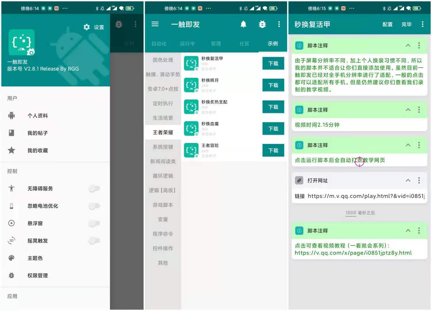 无需root就可进行脚本操作(自动操作手机),且具备脚本自动操作、编写、导出分享甚至可以媲美ios12自带的捷径应用,并且比它更为强大,在软件中由我们创建、可以实现某一功能的「动作」也被称为快捷指令,为了使用户快速上手,软件内置了大量的例子。只要五分钟,就可以快速上手,如:王者荣耀秒换三装、趣头条自动阅读。