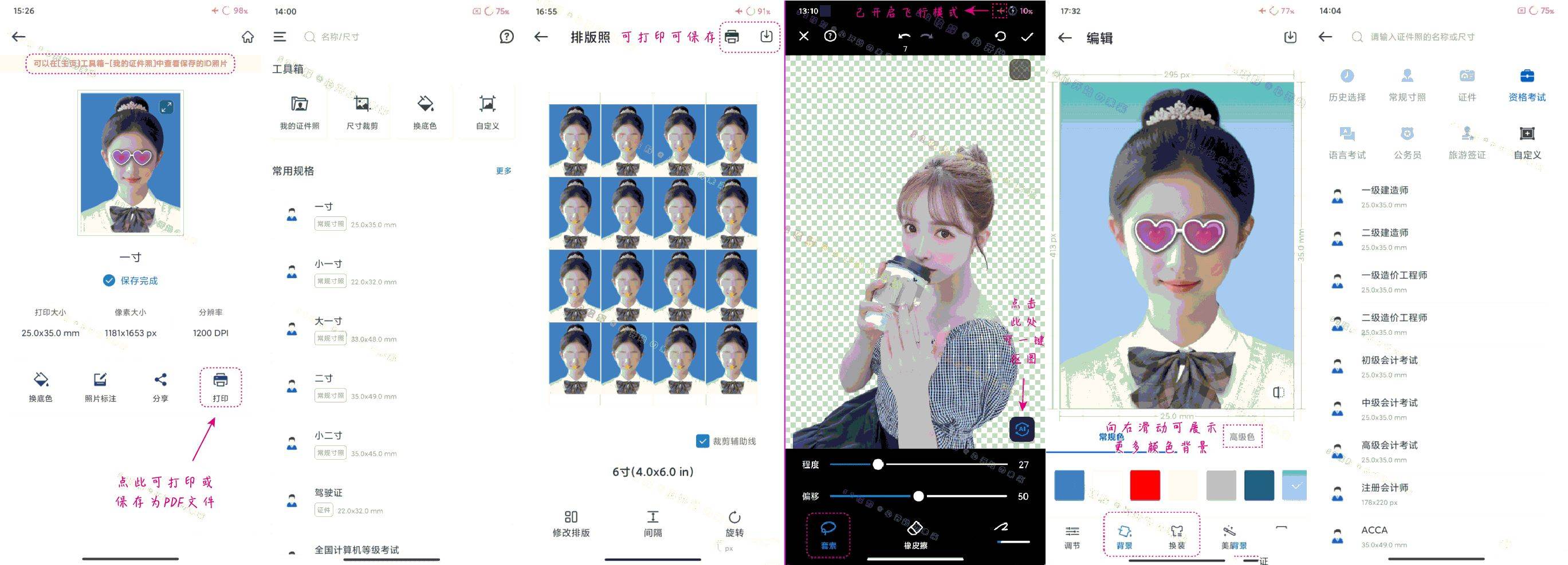 支持JPEG、PNG、WEBP格式和多种分辨率保存PDF电子の证件照,更可生成多种规格未的排版照,如常用的5寸、6寸、8寸、12寸等等规格来排版照(免去照相馆的折腾)。