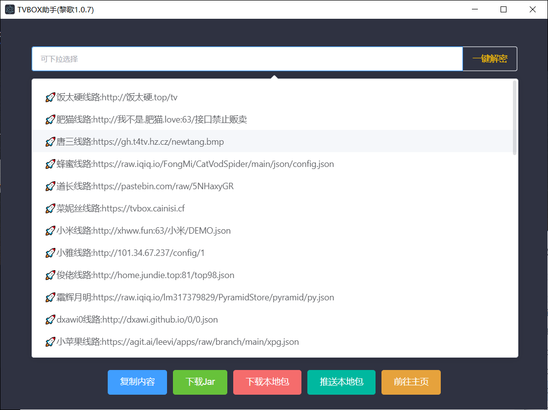 由于电视观影的TVbox是一个不折不扣的空壳,所以一般都是需要自定义来使用的,而一些接口就很不稳定,经常性失效,其实不管啥原因,这个神器就是可以解决你很多使用BOX壳上痛点的神器,这个神器神器是电脑端使用的,下载后直接安装,安装后就会在桌面上生成相应的快捷方式,双击运行就能打开。打开然后界面如下图所示,直接点击搜索框,就能弹出很多下拉的资源,需要哪个直接复制使用。点击 一键捷密 就能获取到它相应的资源,这样复制下来可以DIY成自己的内容。你甚至还可以将在线接口,生成本地包。点击下载本地包后,本地包会自动保存到电脑桌面,并且自动复制链接的配置地址;关键居然还可以把本地化的接口直接推送到电视,这就非常的方便。