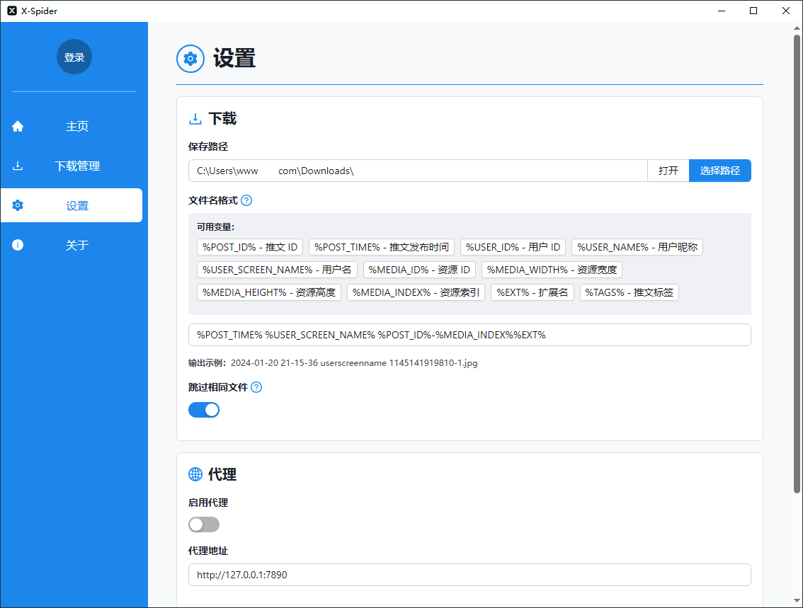 蓝奏网盘 123网盘 夸克网盘 X-Spider是一款功能强大的推特媒体下载工具,不仅可以帮助用户下载推特上的图片和视频,还提供了一系列高级过滤功能。用户可以根据指定的日期范围筛选需要下载的媒体文件,并可以跳过已下载的重复文件,还能自定义文件名格式。此外,X-Spider支持通过Cookie登录,用户可以方便地在自己的设备上保存登录信息,享受更加便捷的操作体验。