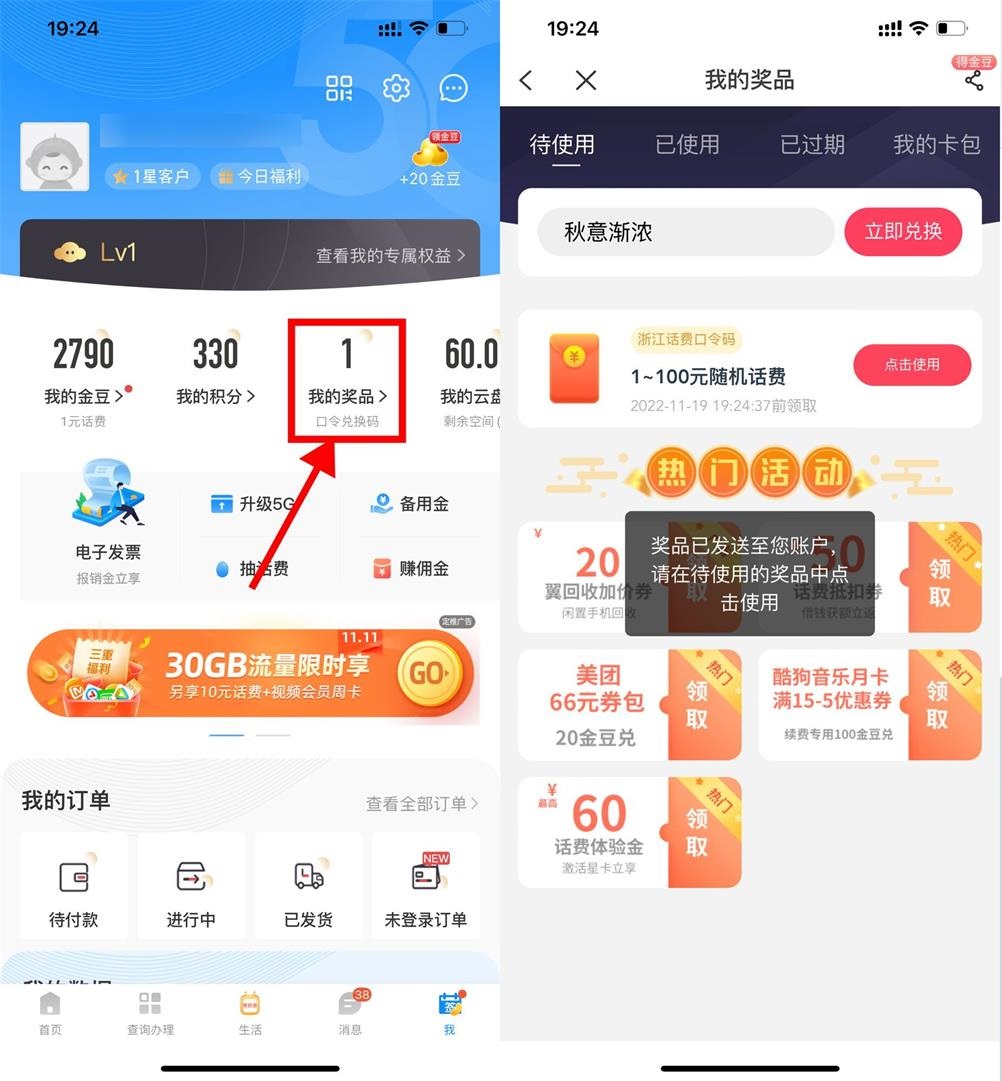 电信APP->我的->我的奖品->输入自己地区对应省份的囗令抽话费广东:天朗气清