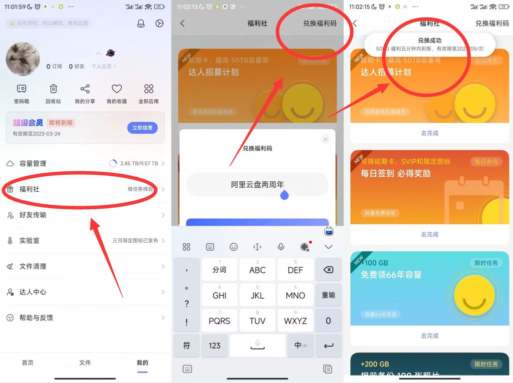 阿里云盘APP->我的->福利社->右上角输入兑换码“