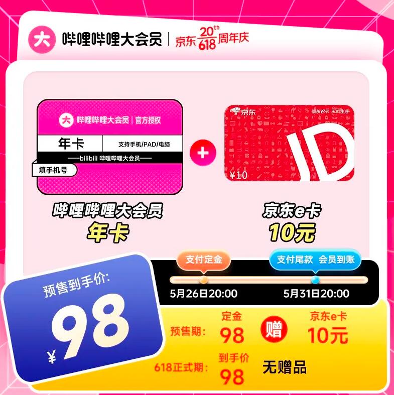 即日起~5 月 31 日 20:00 前“预售期间”下单,官方再赠 10 元京东 E 卡,会员年卡折合仅需 88 元